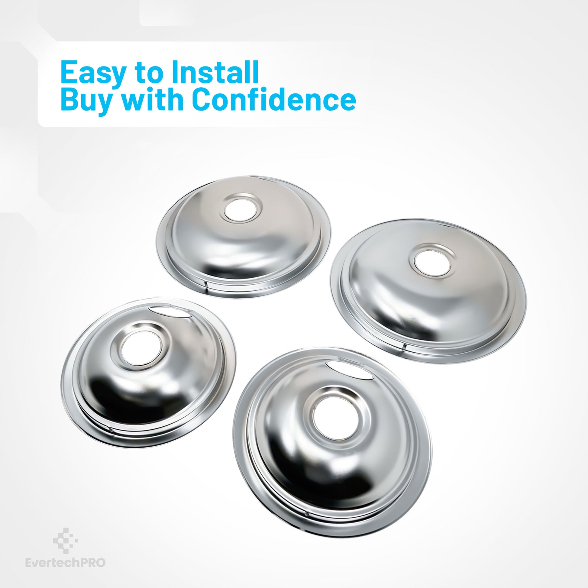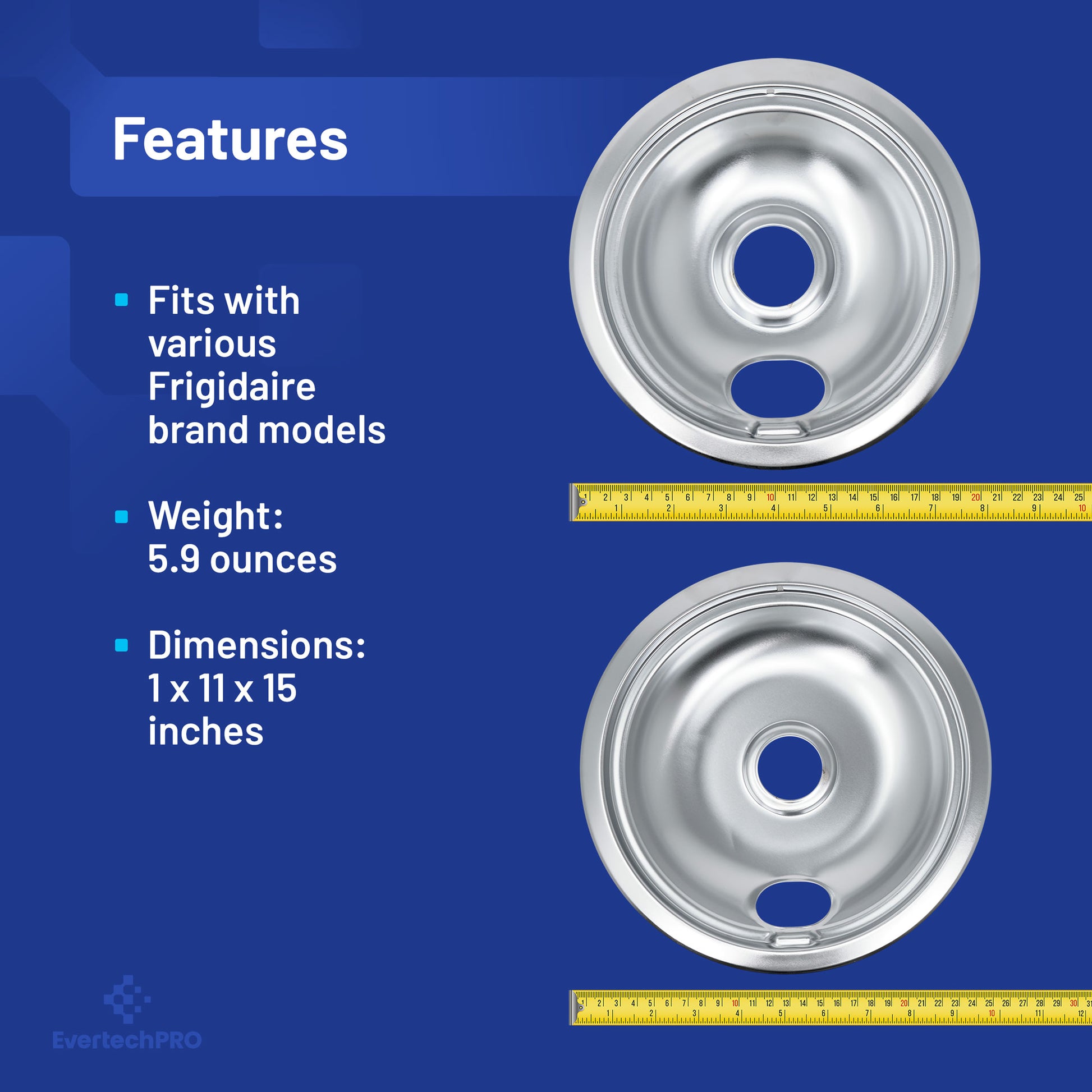Introducing our EvertechPRO 4-pack set of Electric Stove Pans. This all-in-one set includes 2 small 6-inch pans and 2 larger 8-inch pans, offering a comprehensive solution for your stove top needs. Our oven drip pan or stove drip pans are designed to fit Frigidaire and Kenmore models, proving to be the ideal electric stove drip pans set of 4 / drip bowl set 4 pack. The set is made up of two 316048413 (small) and two 316048414 (large) pans. This makes them compatible with a wide range of electric stoves, including compatible with frigidaire electric stove parts, chrome stove drip pans, and more. Our electric stove pans are chrome plated and have a silver finish, giving them a sleek and stylish look that complements any kitchen decor. They are crafted from durable materials to withstand high temperatures and prolonged use, making them a worthwhile investment for your kitchen. These electric stove burner bowls enhance your stove’s efficiency by catching drips and spills, making cleanup easier. They also serve to reflect heat back to the pot, increasing stove efficiency. This pack is not just fits Frigidaire drip pans for electric stove or fits Kenmore stove drip pans, but also fits frigidaire drip pans for electric stove 4 pack, fits kenmore drip pans for electric stove, fits frigidaire electric stove burner drip pans, fits frigidaire stove drip pan, fits kenmore drip pan, fits frigidaire gas stove drip pans, fits frigidaire stove burners, fits kenmore electric stove drip pans. Our stove drip pans for electric stove top are universal, meaning they're designed to fit most plug-in electric ranges. Whether you're replacing your Frigidaire stove drip pans 4 pack, Kenmore electric stove burner drip pans, or searching for new drip pans for frigidaire electric stove our stove replacement drip pans is the perfect fit. The EvertechPRO 4-pack set of Electric Stove Pans is your all-in-one solution for a cleaner, more efficient cooking experience. Invest in our stove top burner drip pans and make your cooking process more convenient and enjoyable. This pack is a must-have for any kitchen with an electric stove.