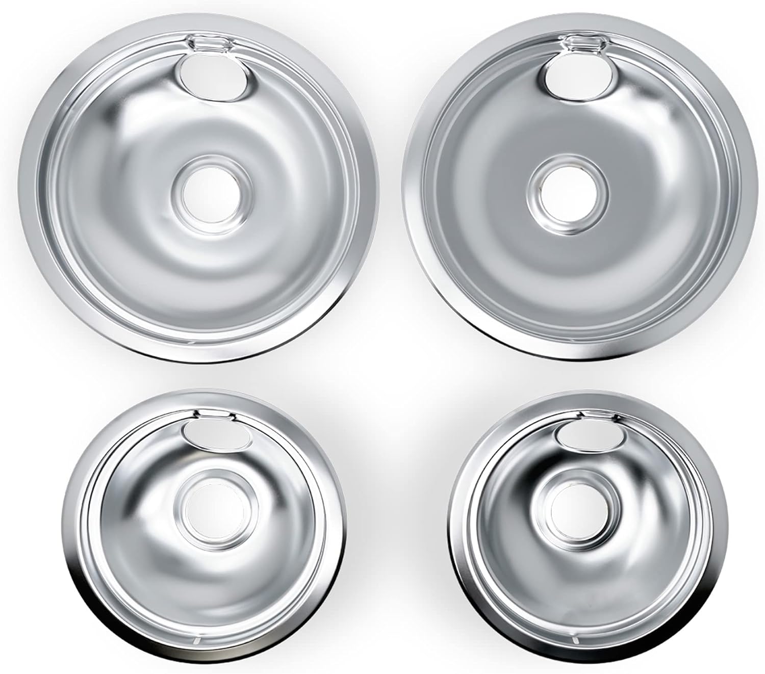 - Universal 4 Pack Set: This all-in-one pack includes 2 small 6 inch and 2 large 8 inch burner drip pans. Perfect as replacement stove drip pans, they are designed to fit universally on most stoves including compatible with frigidaire and fits kenmore models.