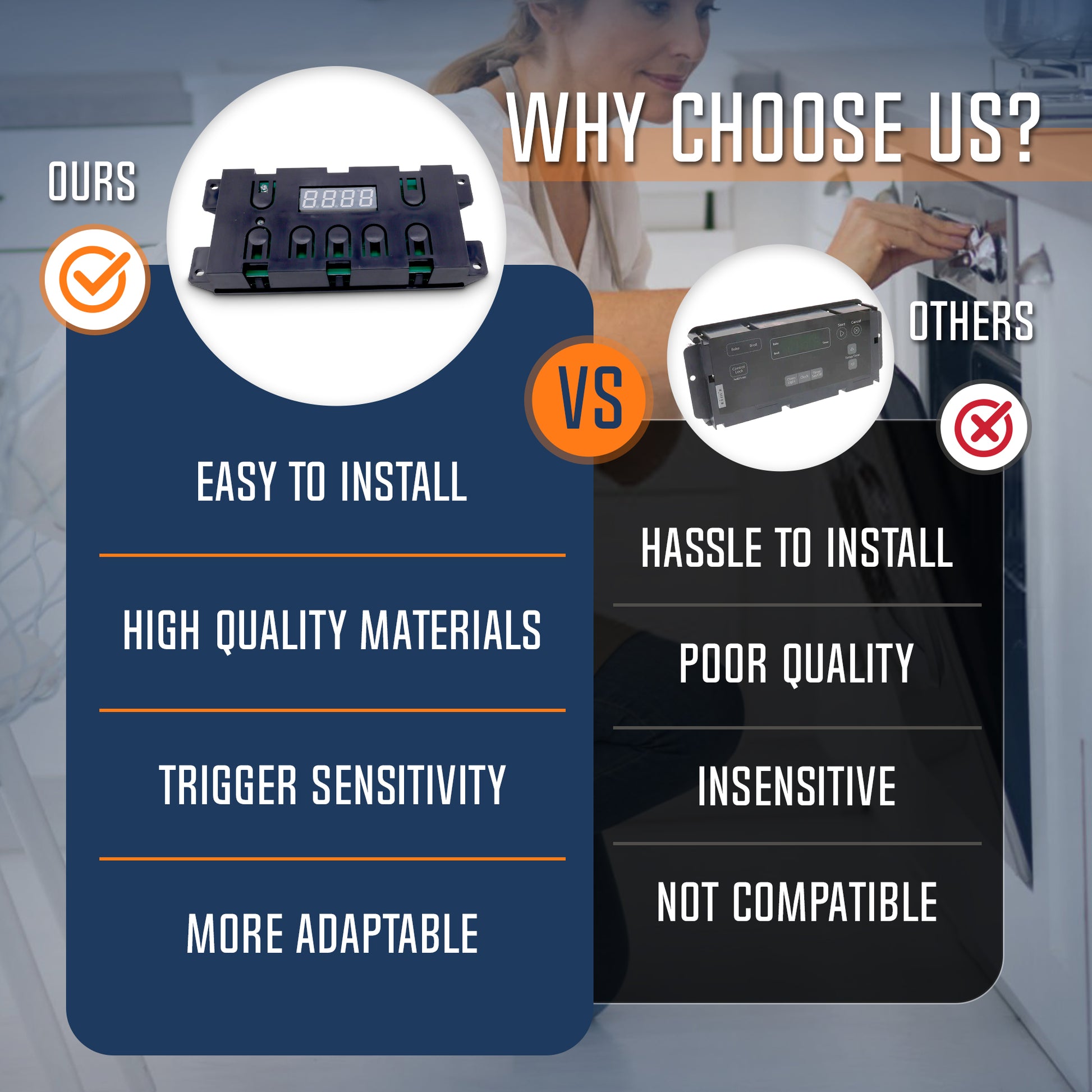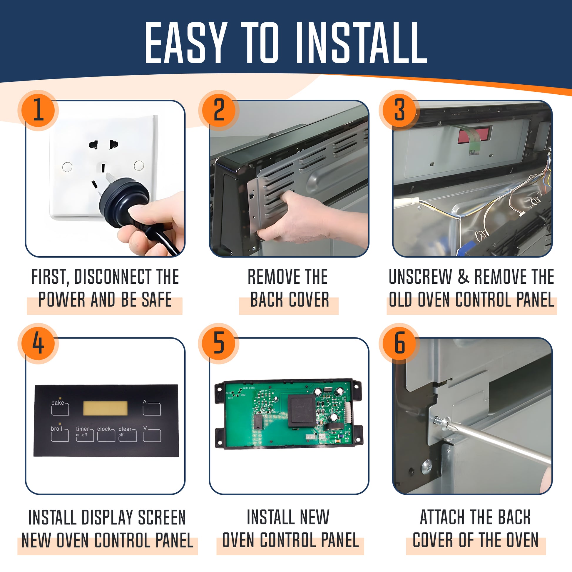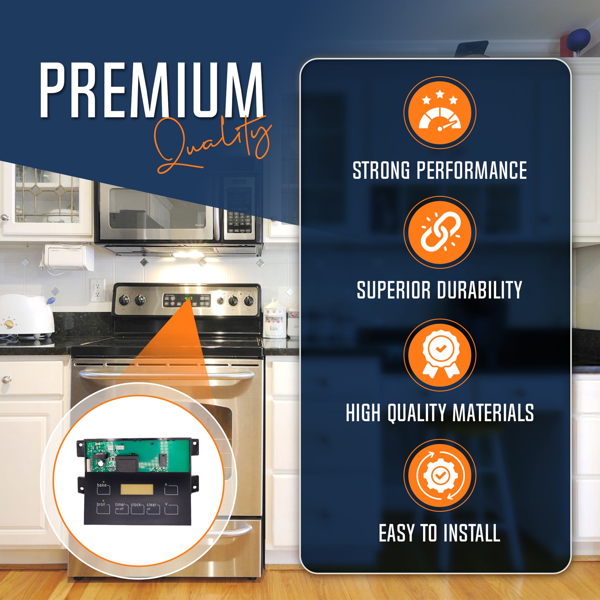 Perfect for ranges with clock/timer control panels, this 7-button interface offers responsive performance to operate bake, broil, timer, clock and other settings. It solves common issues such as unresponsive buttons, bad clock display, or inconsistent heating caused by a faulty control board.