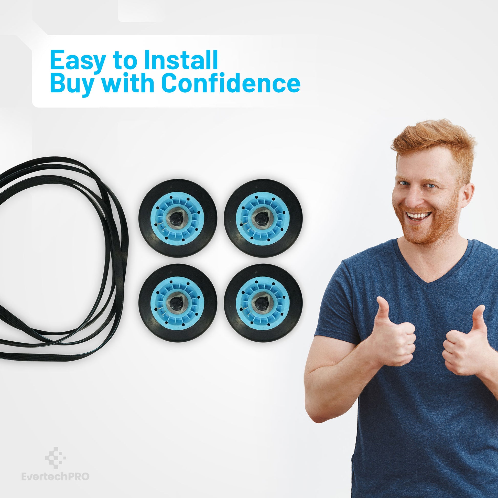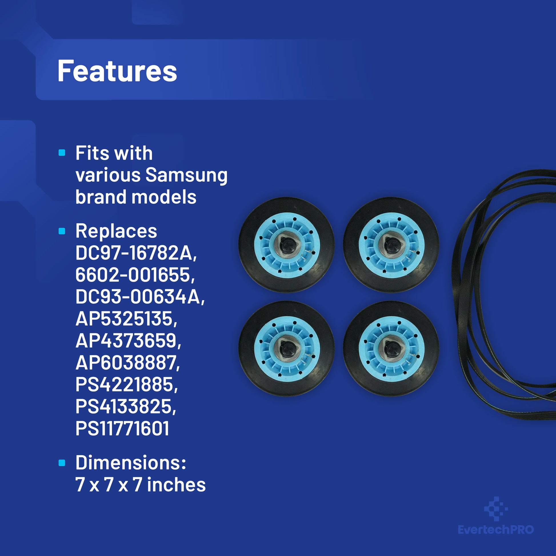 EvertechPRO Dryer Replacement Roller And Belt Repair Kit Part Number DC97-16782A 6602-001655 replaces EAP4221885 PS4218839 EAP42188392027851 DC97-07523A DC97-07523B PS4221885 DE7523 AP5325135 AP4373659 6602-001314 1935594 6602-001314 EAP4133825 PS4133825