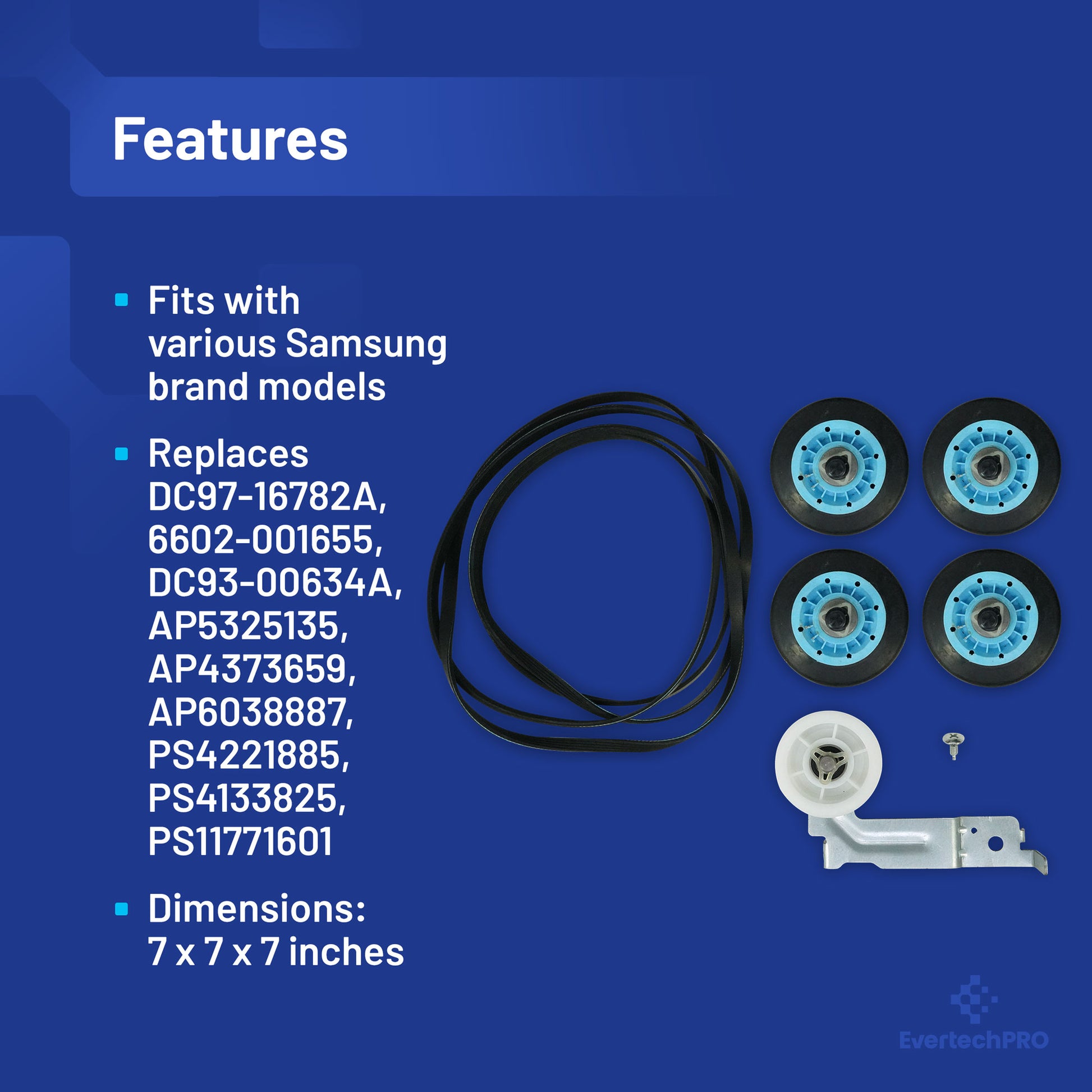 EvertechPRO Dryer Replacement Rollers Belt And Pulley Repair Kit Part Number DC97-16782A 6602-001655 DC93-00634A replaces EAP4221885 PS4218839 EAP42188392027851 DC97-07523A DC97-07523B PS4221885 DE7523 AP5325135 AP4373659 6602-001314 1935594 6602-001314 EAP4133825 PS4133825 AP4373659 6602-001314 1935594 6602-001314 EAP4133825 PS4133825