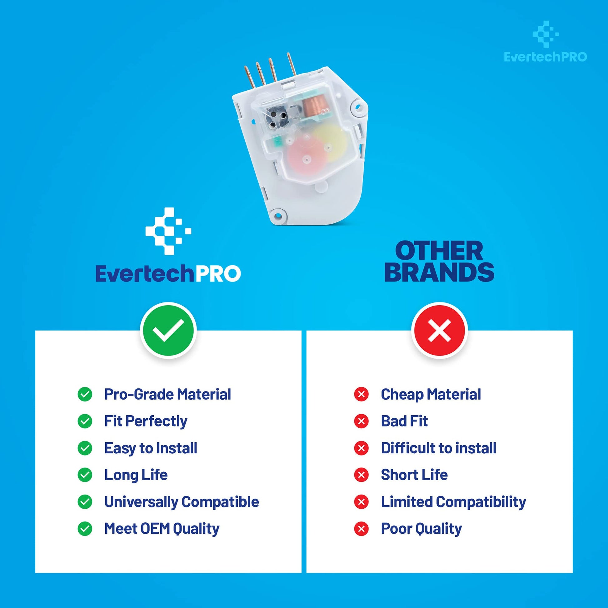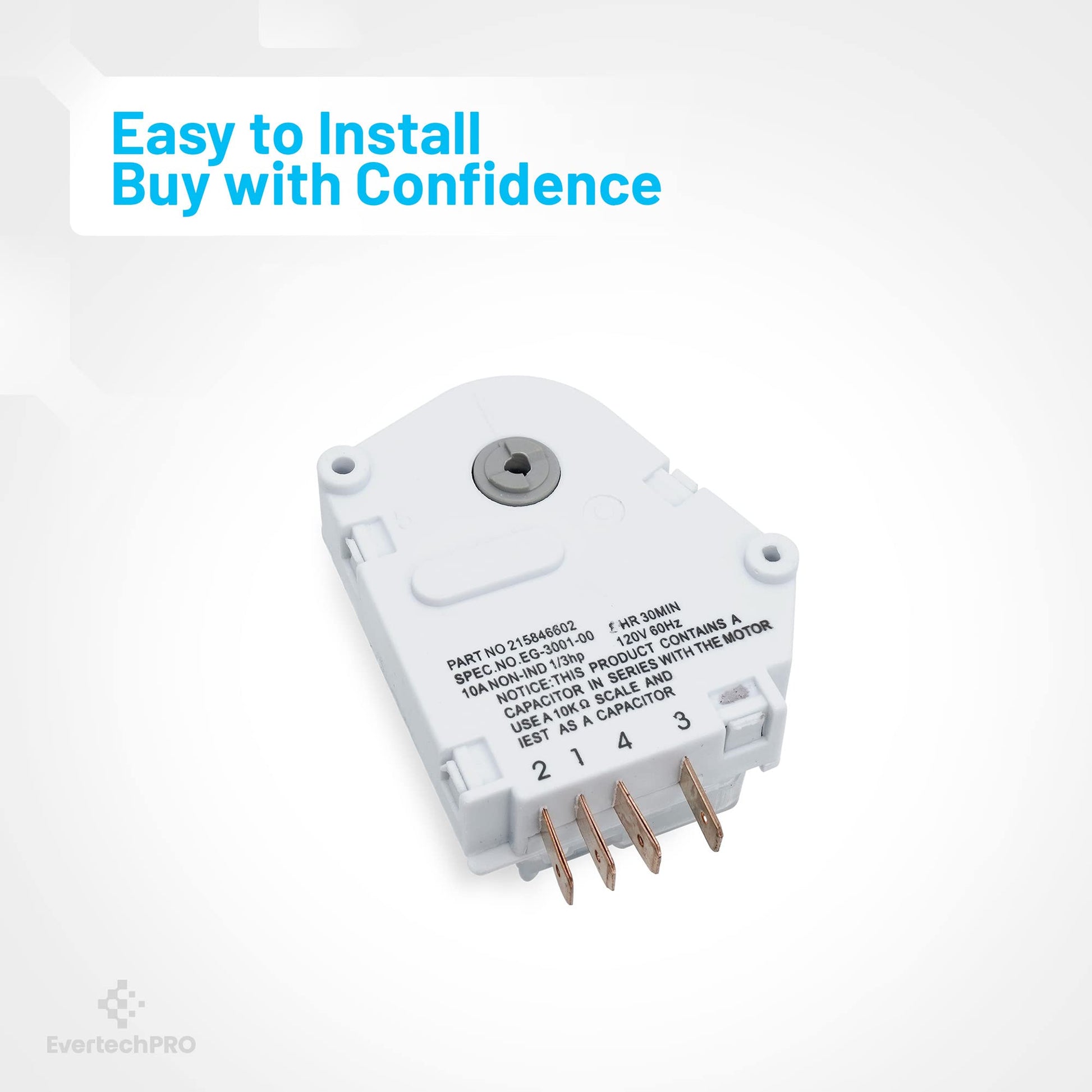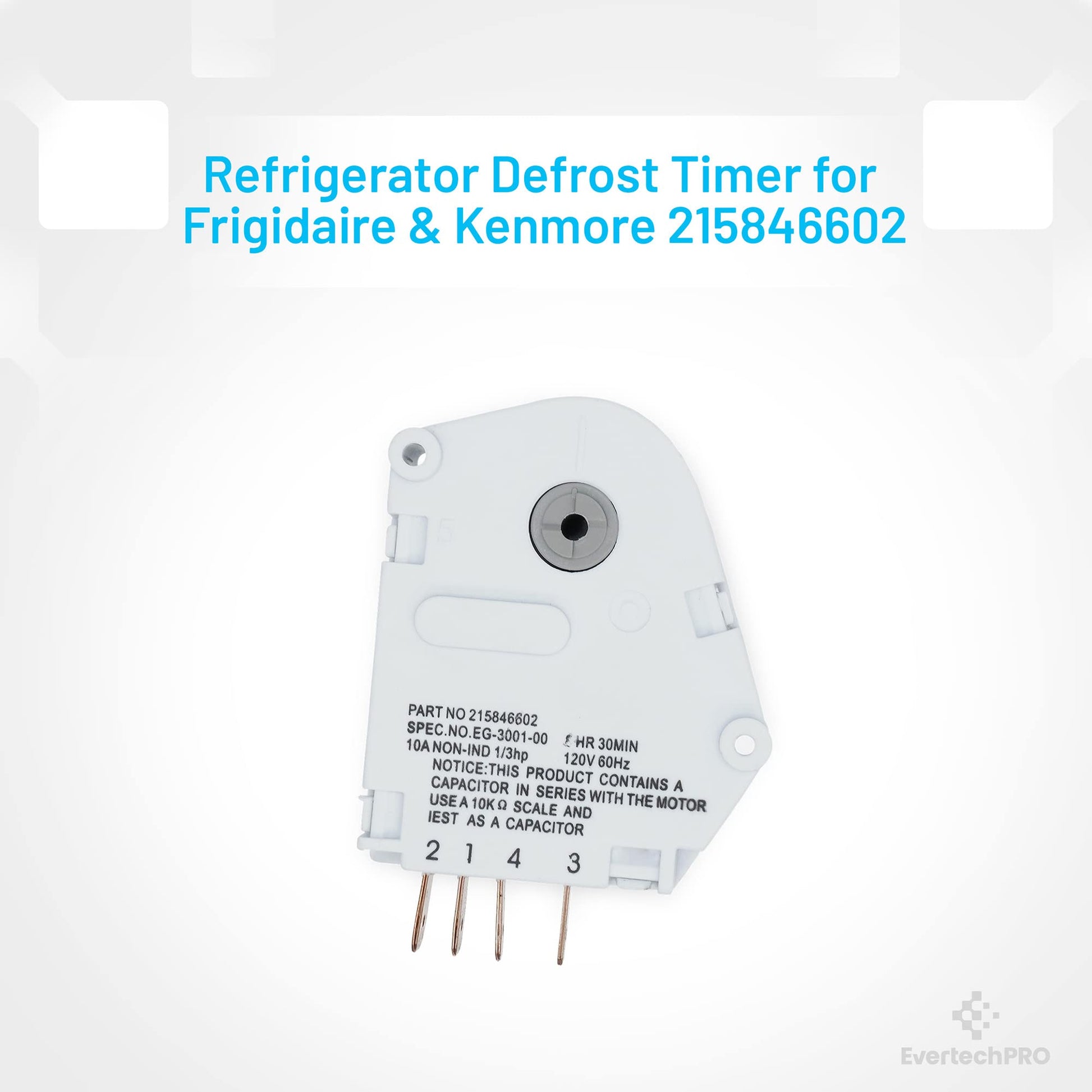 EvertechPRO Refrigerator Replacement Refrigerator Defrost Timer Part Number 215846602 replaces 5304457327 5300628518 00624728 00626234 00628510 00628518 0628510 08000559 08006054 08006992 08016919 08950148 12762 215267800 215846605 215846606 240371001 241621501 3001671 3001701 3015909 3203657 5300187484 5301090474 5303203657 5303211155 5303211680 5303270622 5303275811 5303321133 5303321915 5308006054 5308006992 628518 8000559 AH423801 C000062797 C62797 CC313 CC902 CC925 D007004112 D7004112 DG187005 EA423801 F000111695 G000187484 G172706 G174820 G186580 G187005 G187484 GP4 PS423801 This is not a OEM product. Fits Compatible with 95-1437-00-0195-1437-00-0295-1437-00-0395-1437-00-0495-1437-00-0595-1437-23-0195-1437-23-0295-1437-23-0395-1437-23-0495-1437-23-0595-1437-45-0195-1437-45-0295-1437-45-0395-1437-57-0295-1437-57-0395-1437-66-0195-1437-66-0295-1437-66-0395-1439-00-0095-1439-23-0095-1439-45-0095-1439-57-0095-1439-66-0095-1512-00-0095-1512-00-0195-1512-23-0095-1512-23-0195-1522-00-0095-1522-23-0095-1587-00-0395-1587-00-0495-1587-23-0395-1587-23-0495-1587-45-0395-1587-45-0495-1587-57-0395-1587-57-0495-1587-66-0395-1587-66-0495-1589-00-0095-1589-00-0195-1589Use of the Manufacturers trade names and logos are the registered trademarks of their respective owners. Any use of the Manufacturers brand name, part numbers or model designation for this product is made solely for purposes of demonstrating and for identification compatibility and are displayed for descriptive purposes only. Use of them does not associated with, imply any affiliation or endorsement by any manufacturer.