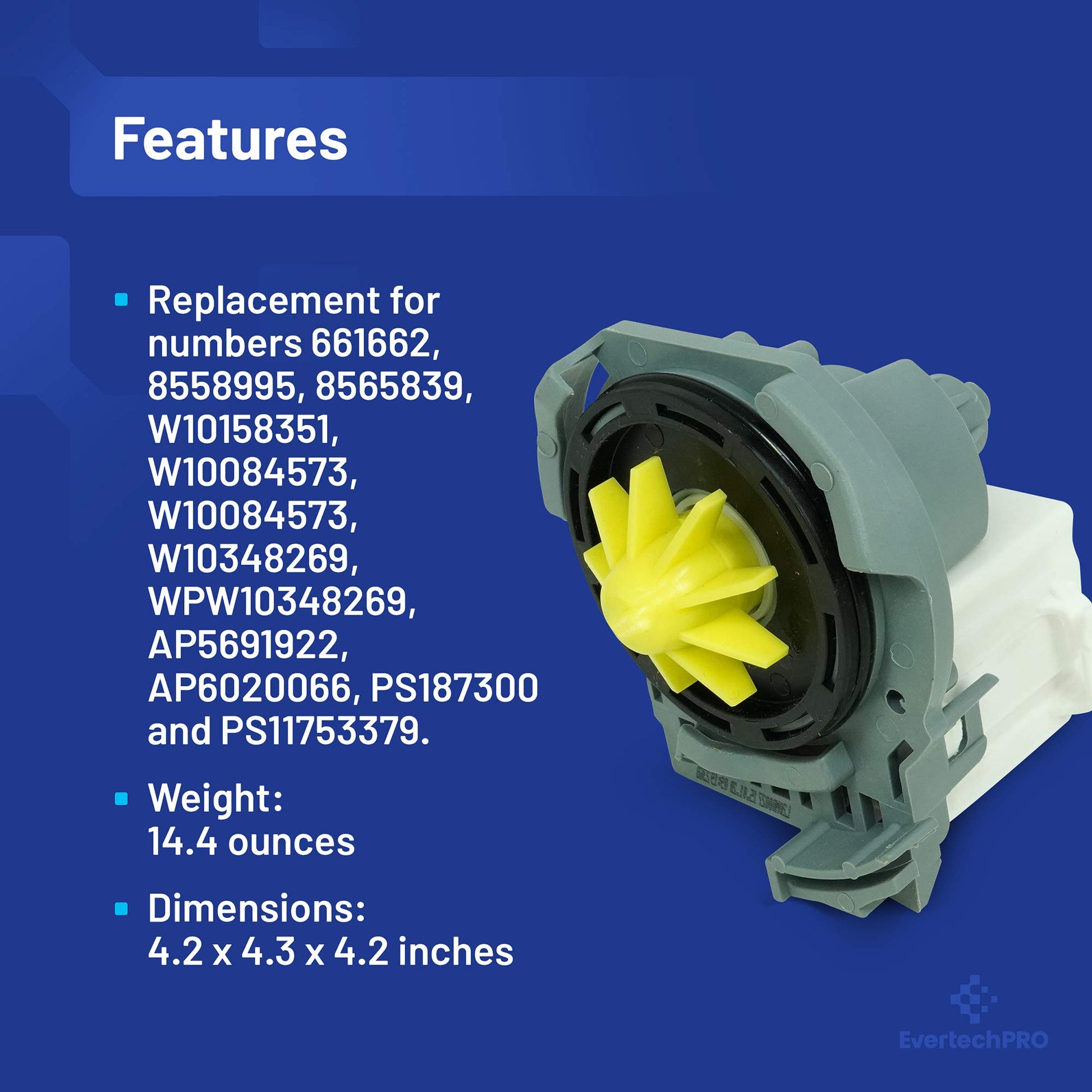 EvertechPRO Dishwasher Replacement Pump-Drain Part Number W10348269 replaces 8558995 661662 W10158351 8565839 This is not a Whirlpool OEM product. Fits Whirlpool Dishwasher. Compatible with ADB1100AWB1 ADB1100AWB2 ADB1100AWB5 ADB1100AWS1 ADB1100AWS2 ADB1100AWS5 ADB1100AWW1 ADB1100AWW2 ADB1100AWW5 ADB1400PYB3 ADB1400PYB4 ADB1400PYB6 ADB1400PYD3 ADB1400PYD4 ADB1400PYS3 ADB1400PYS4 ADB1400PYS6 ADB1400PYW3 ADB1400PYW4 ADB1400PYW6 ADB1500ADB1 ADB1500ADB2 ADB1500ADS1 ADB1500ADS2 ADB1500ADW1 ADB1500ADW2 ADB1700ADB2 ADB1700ADB3 ADB1700ADS2 ADB1700ADS3 ADB1700ADW2 ADB1700ADW3 JDB9000CWB1 JDB9000CWB2 JDB9000CWP1 JDB9000CWP2 JDB9000CWS1 JDB9000CWS2 MDB4409PAB1 MDB4409PAB2 MDB4409PAS1 MDB4409PAS2 MDB4409PAW1 MDB4409PAW2 MDB4709PAB2 MDB4709PAB3 MDB4709PAB4 MDB4709PAM2 MDB4709PAM3 MDB4709PAM4 MDB4709PAQ2 MDB4709PAQ3 MDB4709PAQ4 MDB4709PAW2 MDB4709PAW3 MDB4709PAW4 MDB4949SDE0 MDB4949SDE1 MDB4949SDE2 MDB4949SDE3 MDB4949SDH0 MDB4949SDH1 MDB4949SDH2 MDB4949SDH3 MDB4949SDM0 MDB4949SDM1 MDB4949SDM2 MDB4949SDM3 MDB4949SDZ0 MDB4949SHB0 MDB4949SHW0 MDB4949SHZ0 MDB5969SDE0 MDB5969SDE1 MDB5969SDE2 MDB5969SDH0 MDB5969SDH1 MDB5969SDH2 MDB5969SDM0 MDB5969SDM1 MDB5969SDM2 MDB6769PAB2 MDB6769PAB3 MDB6 Use of the Manufacturers trade names and logos are the registered trademarks of their respective owners. Any use of the Manufacturers brand name, part numbers or model designation for this product is made solely for purposes of demonstrating and for identification compatibility and are displayed for descriptive purposes only. Use of them does not associated with, imply any affiliation or endorsement by any manufacturer.