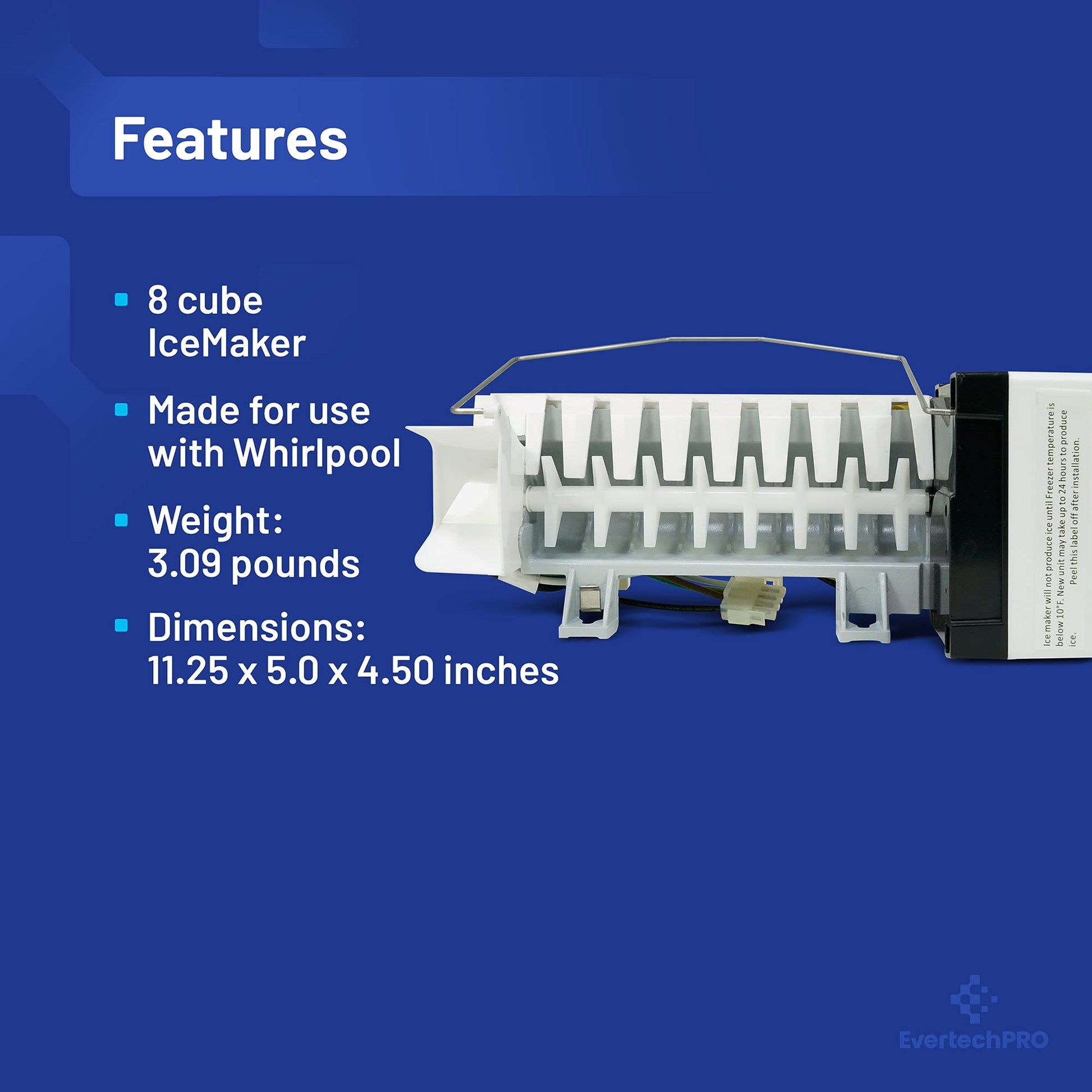 EvertechPRO Appliance Replacement Icemaker Part Number W10884390 replaces W10469286 W10377152 WPW10377152 PS11765620 WPW10469286 This is not a Whirlpool OEM product. Fits Whirlpool Appliance. Compatible with AFD2535DEB10 AFD2535DEB11 AFD2535DEB9 AFD2535DEW10 AFD2535DEW11 AFD2535DEW9 AFD2535FES11 JFC2089BEM00 JFC2089BEM01 JFC2089BEM03 JFC2089BEP00 JFC2089BEP01 JFC2089BEP03 JFC2089WEM11 JFC2089WEM7 JFC2089WEM9 JFC2089WEP11 JFC2089WEP7 JFC2089WEP9 JFC2089WTB5 JFC2089WTB7 JFC2089WTB9 JFC2290VEM6 JFC2290VEM7 JFC2290VEM8 JFC2290VEP6 JFC2290VEP7 JFC2290VEP8 JFC2290VPF3 JFC2290VPF4 JFC2290VPF5 JFC2290VPR2 JFC2290VPR3 JFC2290VPR4 JFC2290VPY3 JFC2290VPY4 JFC2290VPY5 JFC2290VTB3 JFC2290VTB4 MBF1953DEE00 MBF1953DEH00 MBF1953DEM00 MBF1953YEB2 MBF1953YEB4 MBF1953YEW2 MBF1953YEW4 MBF1958DEE00 MBF1958DEH00 MBF1958DEM00 MBF1958FEB00 MBF1958FEE00 MBF1958FEH00 MBF1958FEW00 MBF1958FEZ00 MBF1958FEZ01 MBF1958FEZ02 MBF1958XEB2 MBF1958XEB3 MBF1958XEB5 MBF1958XEB6 MBF1958XEQ2 MBF1958XES2 MBF1958XES3 MBF1958XES5 MBF1958XES6 MBF1958XEW2 MBF1958XEW3 MBF1958XEW5 MBF1958XEW6 MBF2258DEE00 MBF2258DEH00 MBF2258DEM00 MBF2258FEB00 MBF2258FEE00 MBF2258FEH00 MBF2258FEW00 MBF2258FEZ00 MBF2258FEZ01 MBF2258FEZ02 MBF2258XEB3 MBF2 Use of the Manufacturers trade names and logos are the registered trademarks of their respective owners. Any use of the Manufacturers brand name, part numbers or model designation for this product is made solely for purposes of demonstrating and for identification compatibility and are displayed for descriptive purposes only. Use of them does not associated with, imply any affiliation or endorsement by any manufacturer.