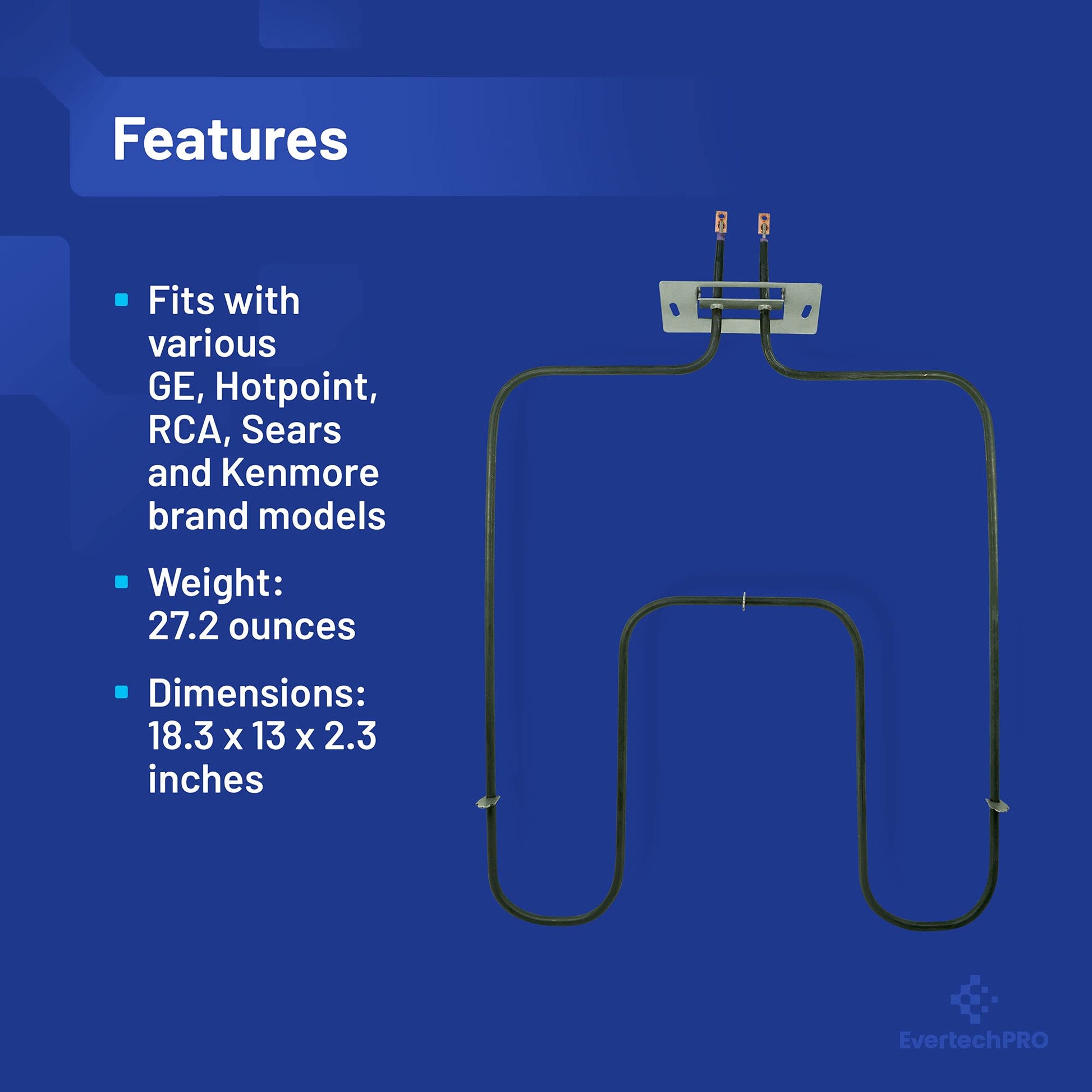 EvertechPRO Wall Oven Replacement Oven Bake Element Part Number WB44X200 replaces TJ90CH44X200 CH44X200 14200023 3267 454483 458290 AH249424 CH44X160 EA249424 ERB44X200 PS249424 R0710083 RP44X160 RP44X200 TS44X160 TS44X200 WB44X0160 WB44X0200 WB44X160 WB44X200 WB44X200R WB44X6200 YCH44X200 This is not a GE OEM product. Fits GE Wall Oven. Compatible with JK25*02 JK29*06 JK29*07 JK29*08 JK29*09 JKP07*07 JKP07*D1 JKP07*J1 JKP07*J2 JKP07*J3 JKP07*J4 JKP07*J5 JKP07*J6 JKP07G*06 JKP07G*D1 JKP07G*H1 JKP07G*J1 JKP07G*J2 JKP07G*J3 JKP07G*J4 JKP07G*J5 JKP07W*N1 JKP16G*07 JKP16G*D1 JKP16G*H1 JKP16G*J1 JKP16G*J2 JKP16G*J3 JKP16G*J4 JKP16G*J5 JKP16G*J6 JKP18G*K1 JKP18G*K2 JKP18G*K3 JKP18G*K4 JKP19G*K1 JKP19G*K2 JKP19G*K3 JKP19G*K4 JKP27*08 JKP27*D1 JKP27*J1 JKP27*J2 JKP27*J3 JKP27*J4 JKP27*J5 JKP27G*07 JKP27G*D1 JKP27G*H1 JKP27G*J1 JKP27G*J2 JKP27G*J3 JKP27G*J4 JKP36*07 JKP36*08 JKP36*09 JKP36*10 JKP36*D1 JKP36G*06 JKP36G*07 JKP36G*08 JKP36G*09 JKP36G*D1 JKP36G*H1 JKP36G*J1 JKP37G*L1 JKP38G*J1 JKP38G*J2 JKP38G*J3 JKP38G*J4 JKP38G*J5 JKP38G*J6 JKP39G*K1 JKP39G*K2 JKP39G*K3 JKP39G*K4 JKP40G*K1 JKP40G*K2 JKP40G*K3 JKP40G*K4 JKP46G*K1 JKP46G*K2 JKP46G*K3 JKP46G*K4 JKP47G*K1 JKP47G*K2 JKP47G*K3 JKP47G*K4 JKP47G*K5 JKP48G*K1 JKP48G*K2 JKP48G*K3 JKP48G*K4 JKP48G*K5 JKP55G*D1 JKP60G*01 JKP60G*02 JKP60G*03 JKP61G*01 JKP61G*J1 JKP61G*J2 JKP61G*J3 JKP62G*K1 Use of the Manufacturers trade names and logos are the registered trademarks of their respective owners. Any use of the Manufacturers brand name, part numbers or model designation for this product is made solely for purposes of demonstrating and for identification compatibility and are displayed for descriptive purposes only. Use of them does not associated with, imply any affiliation or endorsement by any manufacturer.