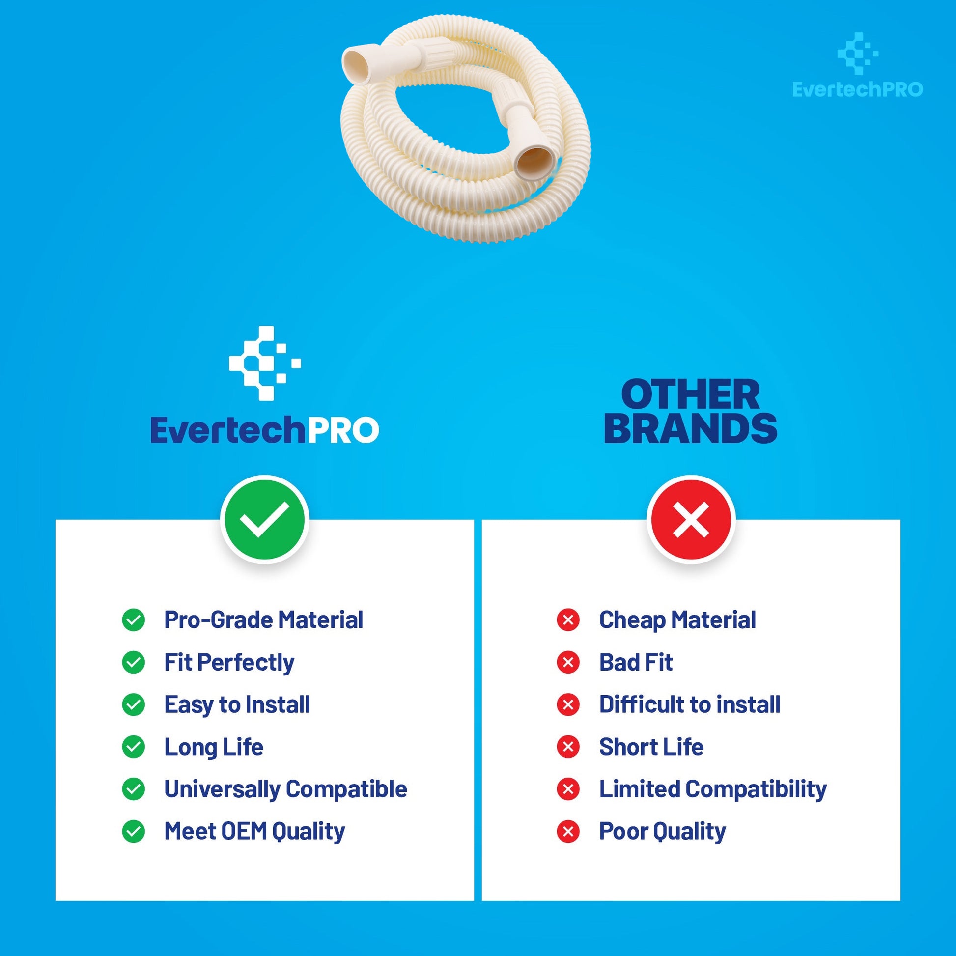 This drain hose is manufactured to original equipment specifications, ensuring correct flexibility, internal diameter, and durability for consistent water flow. The material composition is engineered to withstand hot water, detergents, vibration, and repeated cycle use common in dishwasher environments.