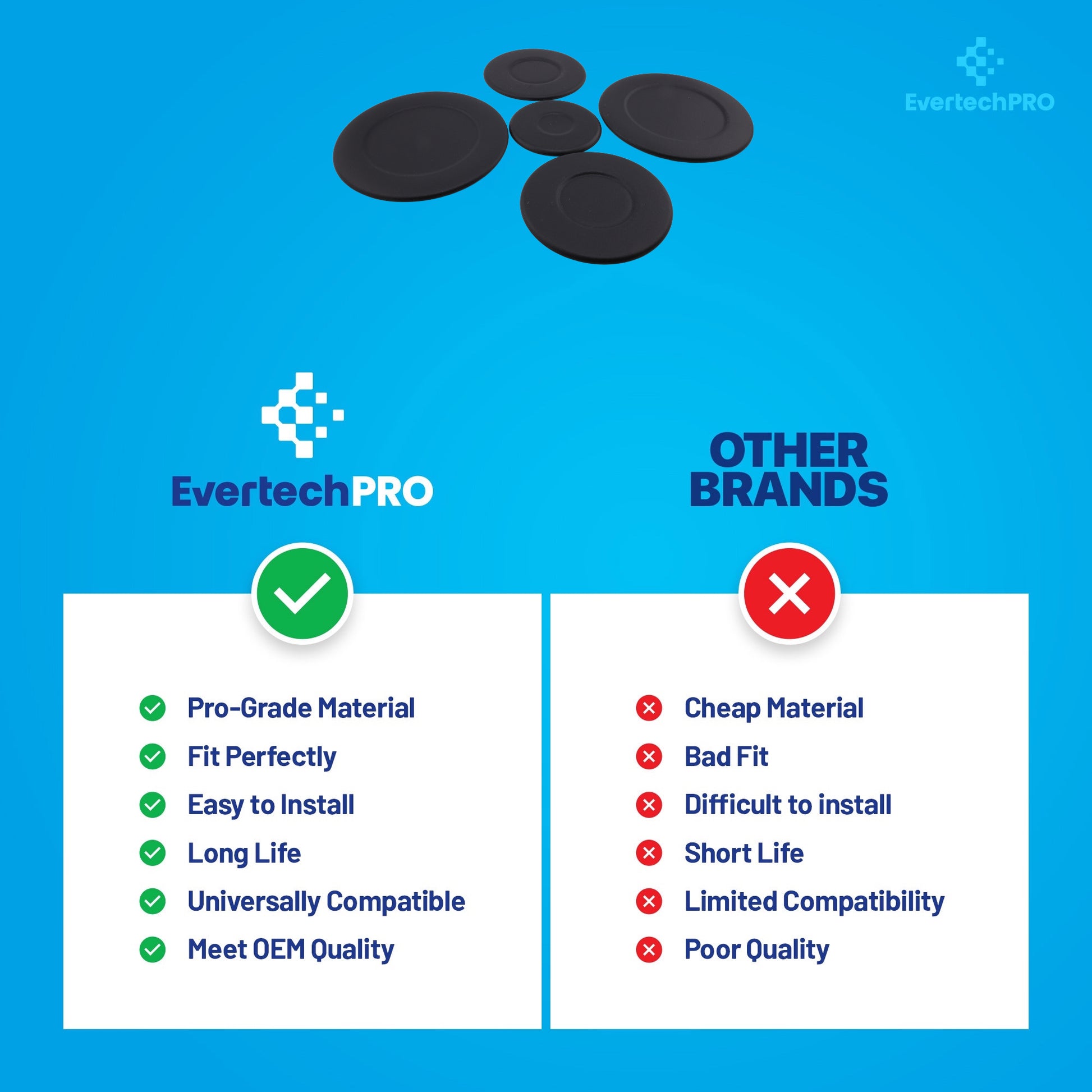 Over time, burner caps may crack, warp, or become clogged due to heat exposure and daily use, leading to uneven flames or reduced cooking efficiency. This EverTechPro replacement set is manufactured to OEM-quality standards, ensuring reliable fit, stable positioning, and long-lasting durability—without using restricted OEM branding language.