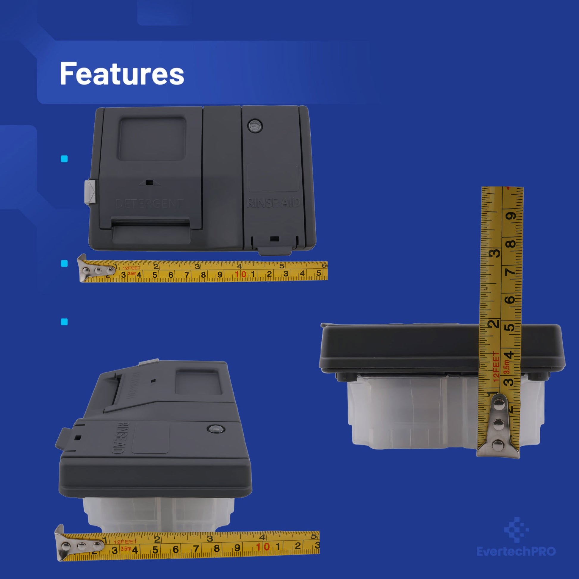 Restore your dishwasher’s cleaning power with the EVERTECHPRO WD12X24060 Detergent Dispenser Assembly – a high-quality replacement compatible with GE, Hotpoint, RCA, and Sears dishwashers. This dispenser includes a wax motor and three‑spade connector sensor along with a 13.5 V DC, 7 W solenoid assembly to ensure accurate detergent and rinse aid release during wash cycles. This soap cup unit directly replaces part numbers: WD12X24060, WD12X26146, WD12X10460, WD12X20247, WD12X20391, WD12X21056, WD12X22577, WD12X22578, WD12X23541, WD12X24059, WD12X24058, WD12X28240, 265D1231P018, AP6333898, PS12577530 and fits many GE-manufactured models including the GE Café series, Hotpoint, RCA, and Sears dishwashers If your dishwasher is not dispensing detergent, rinse aid is leaking, or the dispenser door is stuck, this WD12X24060 unit is the proven fix. Built with durable plastic and metal components, this assembly withstands daily high-heat dishwasher cycles, providing long-lasting, leak-free performance. The OEM-style solenoid and wax motor sensor assembly meets or exceeds factory specifications for reliability. Direct replacement for GE part WD12X24060 and multiple cross‑reference numbers Compatible with GE Café models, as well as Hotpoint, RCA, and Sears dishwashers Solves detergent/rinse aid dispensing failures, stuck dispenser door issues, wax motor/sensor malfunctions Includes 13.5 V DC, 7 W solenoid assembly and three‑spade connector for precise timing Built to OEM specs – durable, stable lab-tested fit from EVERTECHPRO